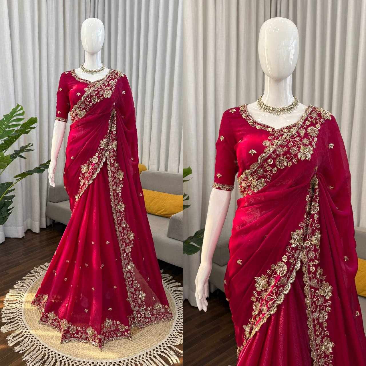 Fall in love with this stunning saree in an eye-catching shade, beautifully crafted with rich detailing and glamorous finishing. A perfect blend of grace and statement style for your special occasions.